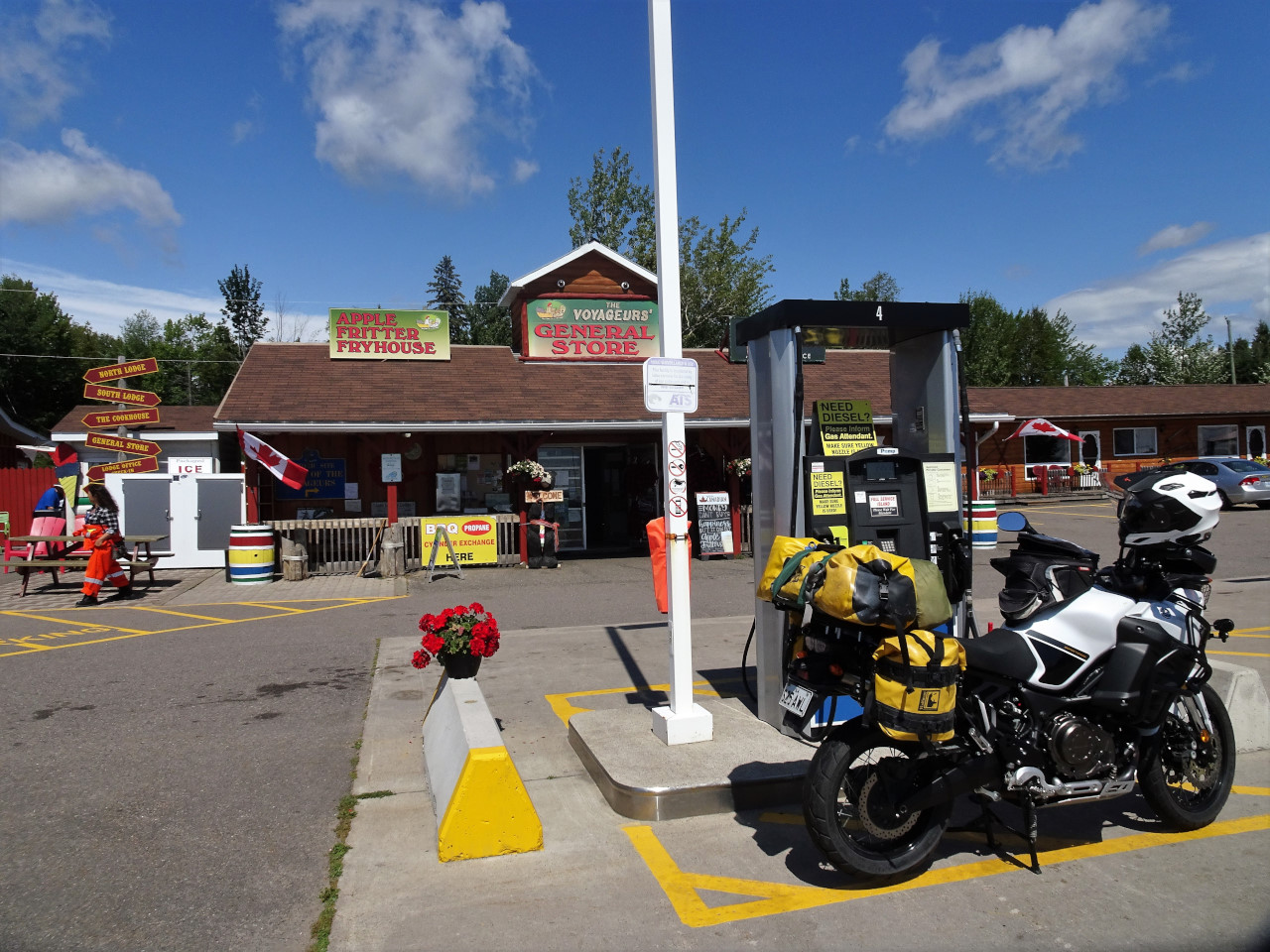On the opposite side of the road I see that a guy is using a chainsaw to cut up firewood. I ride Stan over and have a chat to him. I tell him my fuel issue and no dramas – there is another trading post just 10 klms further up where I can refuel. The guy (Barry) is a retired school principal that loves Aussies as he had half a dozen exchange teachers from Australia during his career. Barry offers to give me some fuel but no need as I can make the 10 klms. Sure enough 10 klms up the road I find Voyageurs Post;